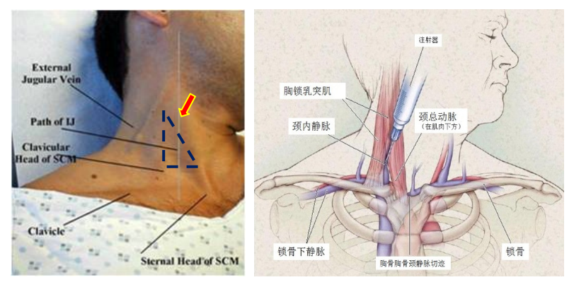 Ø 颈内静脉穿刺:患者取仰卧位,头部转向对侧,可垫高颈部使头后仰。