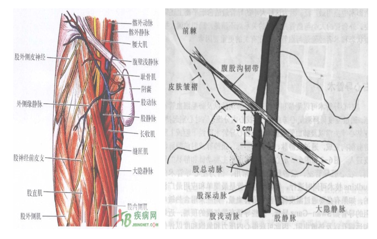 Ø 股静脉穿刺:穿刺点定位于髂前上棘与耻骨结节连线的内1/3下方2~3 cm处,股动脉搏动点内侧0.5~1.0 cm,体表投影相当于腹股沟韧带中内1/3交界处下方约2~3 cm处。